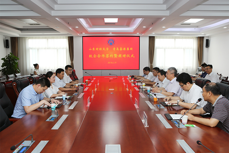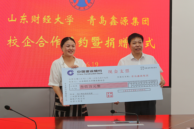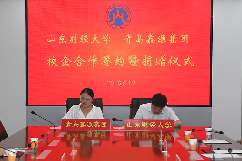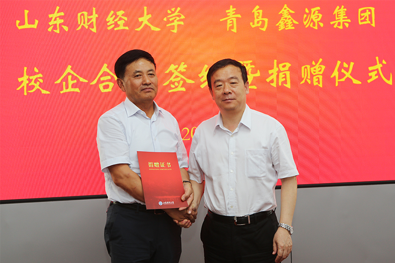 6月19日下午,我校与青岛鑫源集团校企合作框架协议签约暨捐赠仪式在燕山校区举行。根据协议,我校与青岛鑫源集团共建“山东财经大学青岛创新创业园”(简称“青岛双创园”),同时,青岛鑫源集团首期捐赠300万元助力学校发展。校党委书记王邵军出席仪式并向青岛鑫源集团董事长辛熙源颁发捐赠证书,副校长张新主持仪式并致辞。